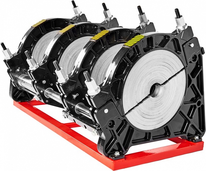 - Центраторо с гидравлическим приводом и 4-мя прочными широкими зажимами, один из которых легко может быть удален для облегчения сварки полимерных фитингов с трубами (тройники, крестовины, отводы), имеет большой запас прочности за счет качественного сплава и ребер жесткости, что позволяет сваривать полимерные трубы с любым показателем SDR